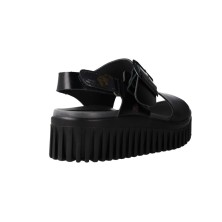 Die Silhouette entspricht der bekannten Brighton-Plateausohle, wirkt in komplett Schwarz jedoch völlig anders als die Honey-Version. Ohne farblichen Kontrast entsteht ein starker schwarzer Gesamtblock mit fast stiefelartiger Präsenz.