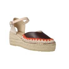 Der Kontrast zwischen dem braunen Obermaterial in Lederoptik und der orangefarbenen Stickerei verleiht dem Modell eine starke Persönlichkeit und hebt es deutlich von klassischen Espadrilles ab.