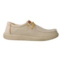 El Walk In Pitas WP150 Steve es un náutico casual tipo wallabi para hombre, fabricado en 90% textil (55% poliéster + 45% algodón) con 10% de serraje en el parche de talón, forro interior de algodón y Spandex, plantilla extraíble de EVA y corcho extra gruesa, y suela EVA ultralight termoconformada de 2,5 cm. Pesa aproximadamente 150 g por zapato. El cierre es mediante cordones elásticos Easy On sin atado, con par extra al tono incluido. Los cordones varían por color: verde agua en Azul, mostaza en Beige, terracota en Taupe. Lavable en lavadora en frío. Marca española fundada en Asturias en 2015. Es el modelo WP150 con más textura y carácter rústico de la colección de hombre, diferenciándose del Ryan por la lona de saco, el serraje en talón y la plantilla de corcho.
