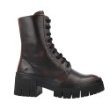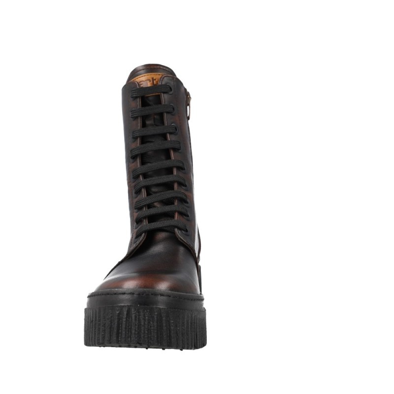 El color castaño oscuro con efecto desgastado resalta la textura natural del cuero y refuerza su estilo contemporáneo, mientras que la suela negra voluminosa añade un toque moderno y rompedor. Su estética recuerda a los clásicos modelos de combate reinterpretados con un aire artístico y urbano.