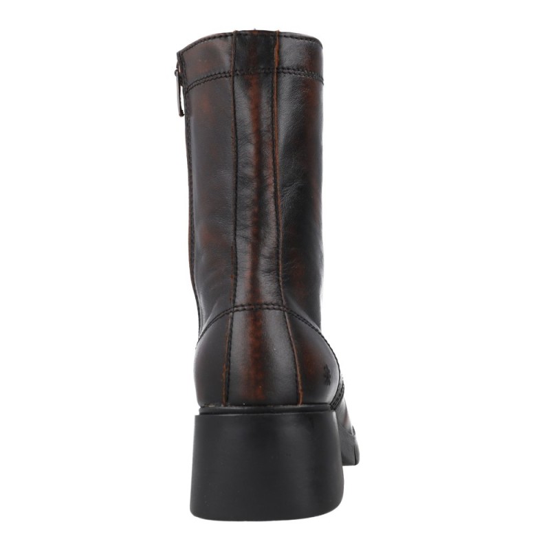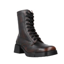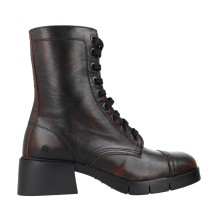 El acabado castaño oscuro con matices cobrizos dota al cuero de un aspecto envejecido y artesanal que realza su carácter único. La suela robusta, junto con los cordones y herrajes metálicos, aportan un aire industrial y contemporáneo que combina perfectamente con la moda actual.