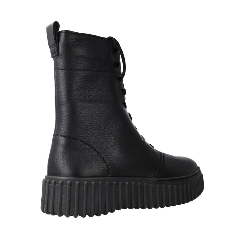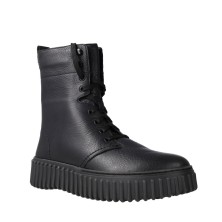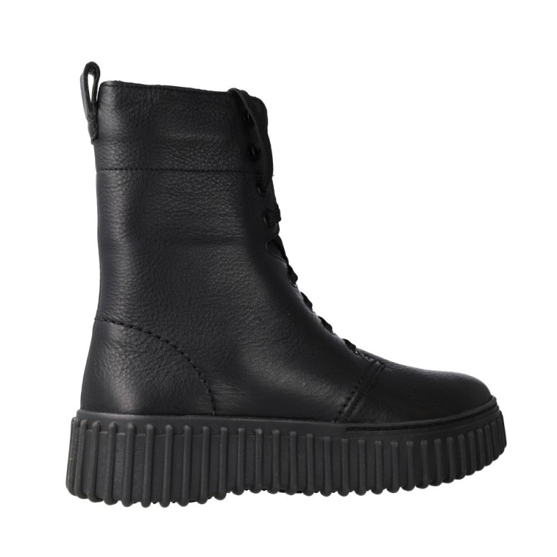 La suela elevada con efecto cuña —uno de los iconos de la colección Torhill— estiliza la figura y proporciona una pisada firme, absorbente y estable. No es un simple botín negro: es una pieza que recoge el legado Wallabee, lo moderniza y lo adapta a las exigencias actuales de comodidad y estilo.