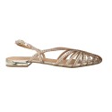 Su propuesta es clara: tiras trenzadas, acabado metalizado y tacón bajo, una fórmula muy efectiva para conseguir un look cuidado sin sacrificar comodidad.