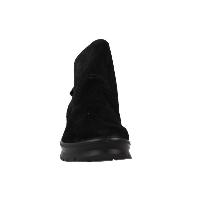 Piel de Serraje "Velour" Negro: El cuerpo del botín está confeccionado en piel de serraje de alta calidad con un tacto aterciopelado. El color negro es intenso y uniforme, aportando una textura rica que eleva la categoría del calzado.