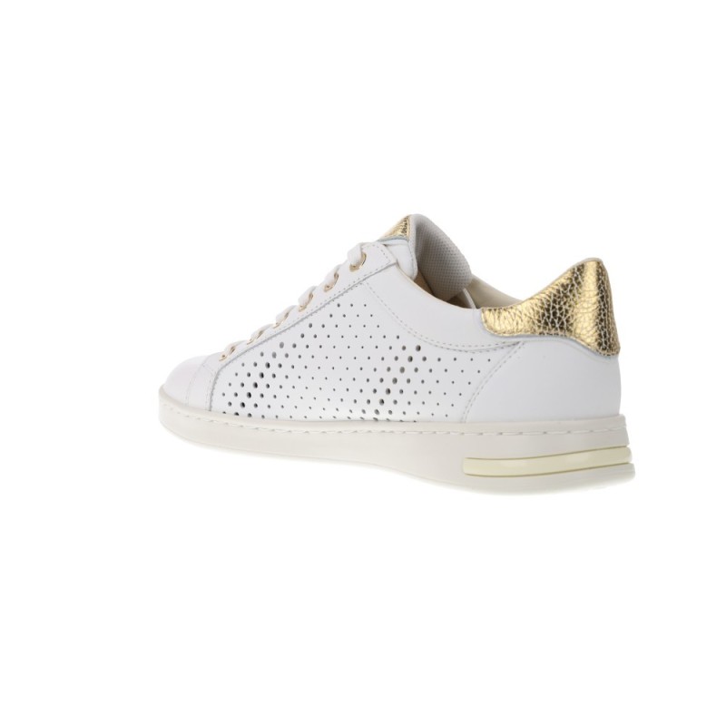 Le modèle Geox D Jaysen B se distingue par son esthétique minimaliste en cuir blanc de haute qualité, avec des perforations latérales qui non seulement ajoutent une touche moderne mais favorisent également une meilleure circulation de l'air à l'intérieur de la chaussure. Son design est sublimé par des détails en doré métallique au talon et aux œillets, apportant une touche de luxe et de distinction sans perdre son essence décontractée.