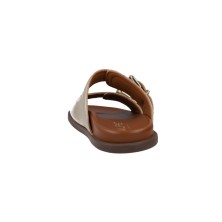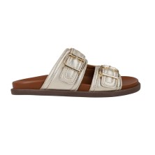 Le cuir doux et rembourré offre une sensation agréable au toucher, tandis que les boucles dorées ajoutent une touche de glamour discrète. La structure ouverte garantit une aération optimale, idéale pour les journées les plus chaudes.