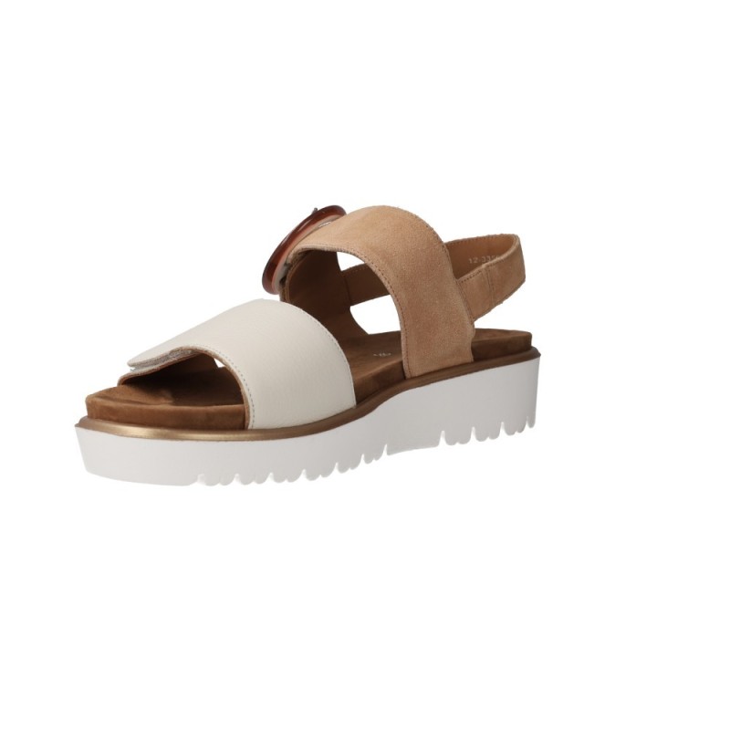 Sandalo con zeppa da 5 cm e cinturino slingback regolabile, disponibile in sabbia-crema bicolore e crema. Pelle di qualità, design pulito e costruzione curata.