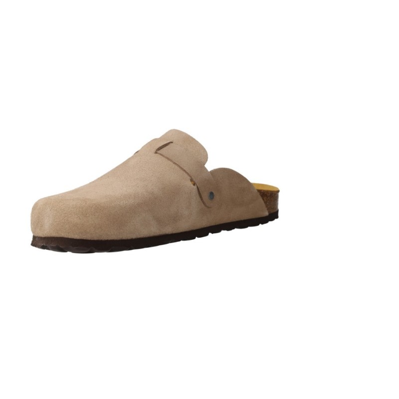 Il modello combina tomaia in camoscio color pietra, soletta anatomica in sughero con base in gomma antiscivolo, fibbia metallica regolabile e cinturino posteriore per un maggiore sostegno.